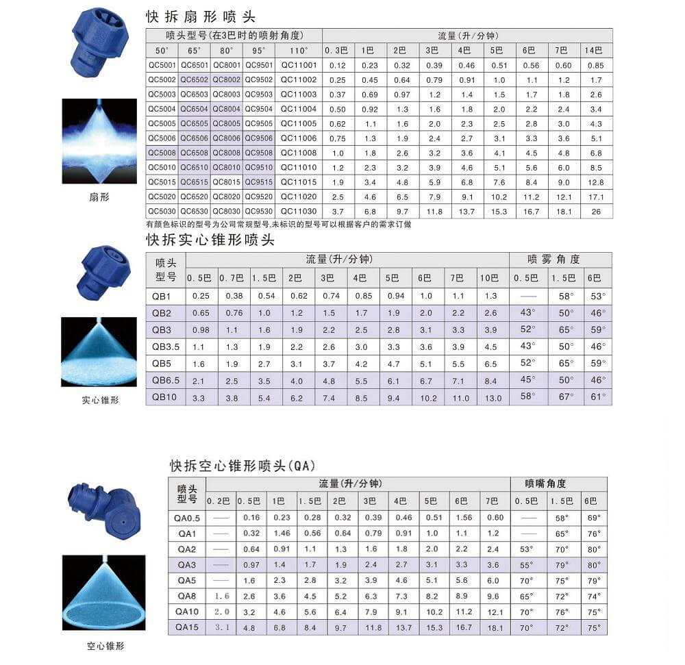 心錐形和QA空心錐形三種類(lèi)型,分別提供扇形、實(shí)心錐形和空心錐形三種噴霧模式,并有多種流量和角度可供選擇。