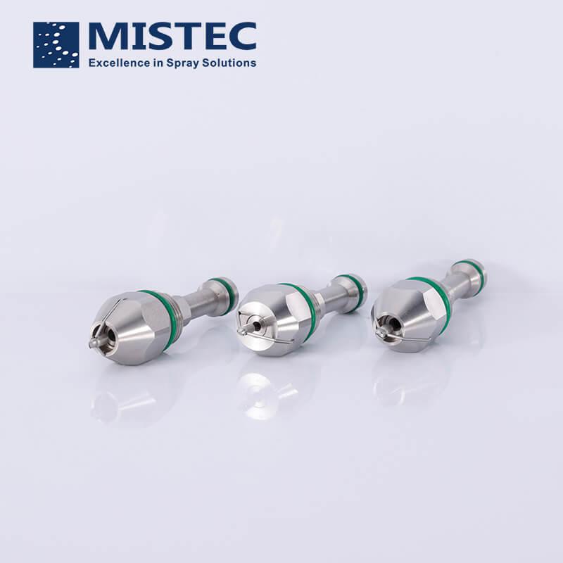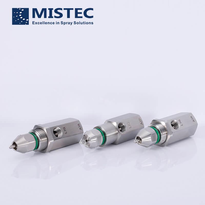 液體和壓縮空氣在噴嘴內(nèi)部混合,再經(jīng)由緊密的機(jī)械超聲振子(也稱為超聲波發(fā)生器)再次霧化,產(chǎn)生極細(xì)的噴霧顆粒。